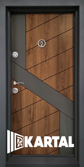 Блиндирана врата с модерен дизайн. Изработена е от два МДФ панела с дебелина 10 мм с ламинирано покритие.